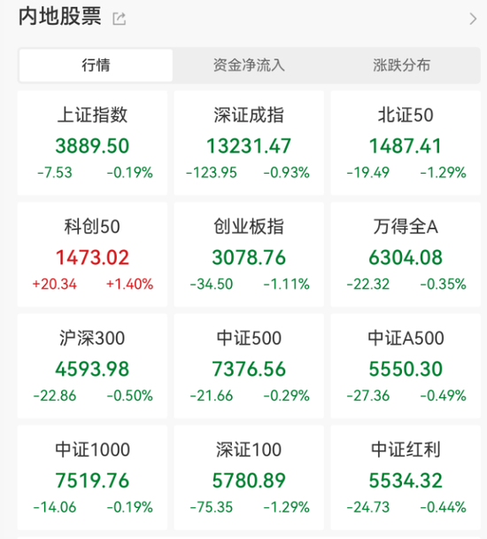 10月13日,A股上午大幅度低开,随后一路回升,沪指尾盘一度接近平盘。截至收盘,沪指跌0.19%,深成指跌0.93%,创业板指跌1.11%,表现最好的是科创50指数,涨1.4%。
